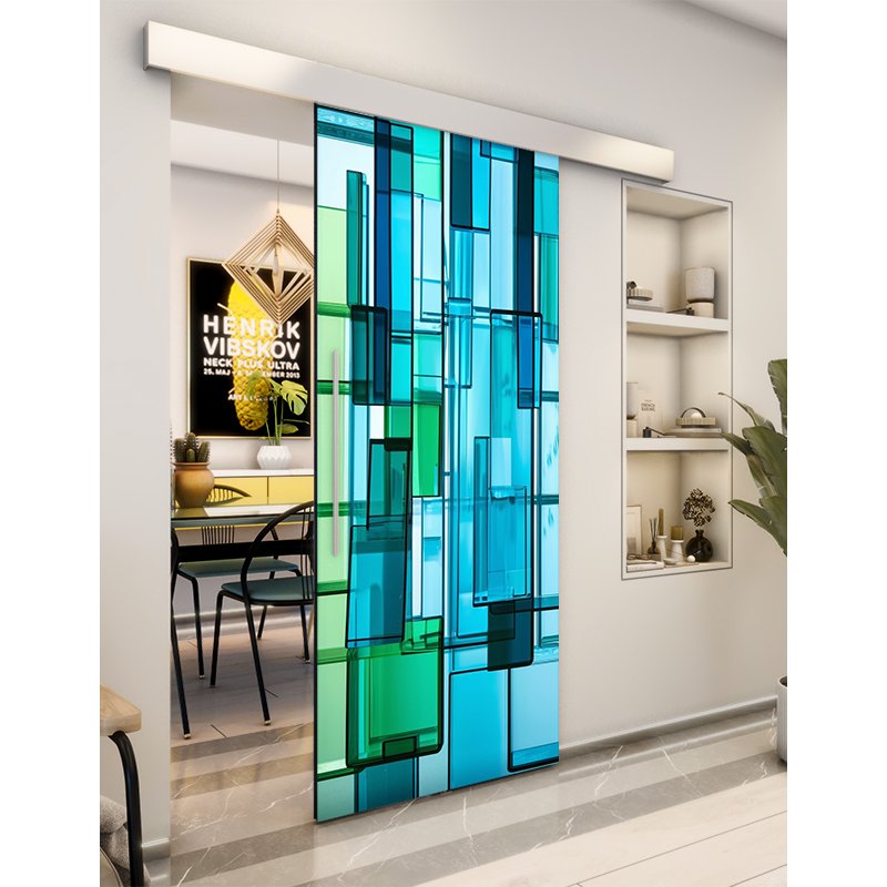 Das Bunte Geometrische Motive in 3d optik verleiht dieser Tür ihren besonderen Charakter.