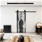 Das offen hängendes, schwarzes schiebetürsystem in scheunentor-optik garantiert eine mühelose Bedienung und unterstreicht den modernen Look.