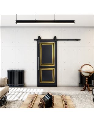 Das raffinierte offen hängendes, schwarzes schiebetürsystem in scheunentor-optik bringt eine moderne Note in Ihr Zuhause.