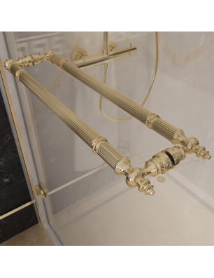 Tauchen Sie ein in pure Eleganz und Luxus mit unserer Glasdusche im klassischen Design, veredelt durch goldfarbene Beschläge. Erleben Sie den Glanz und die zeitlose Schönheit, während Sie sich in Ihrer eigenen Oase der Entspannung verwöhnen lassen.