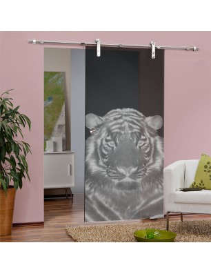Glasschiebetür PIPE-LINE Tigerkopf Gelasert Auf Grauglas
