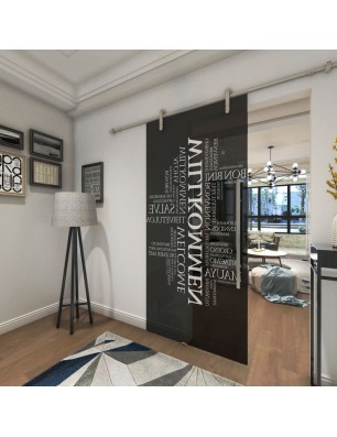 Glasschiebetür PIPE-LINE Willkommen Gelasert Auf Grauglas