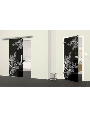 Im Lieferumfang enthalten: Glasschiebetür mit Lasergravur-Optik, SLIM-Line Beschlagsystem, Griff nach Wahl