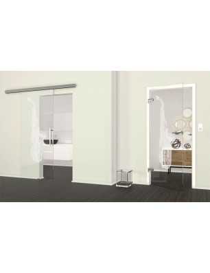 Im Lieferumfang enthalten: Glasschiebetür mit Lasergravur-Optik, SLIM-Line Beschlagsystem, Griff nach Wahl