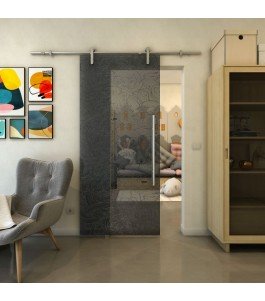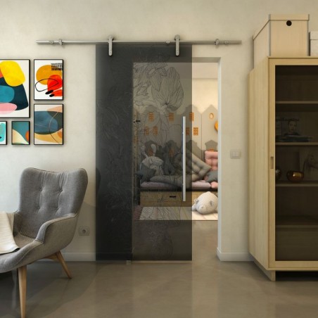 Das Fineprint wird präzise in das Grauglas eingebrannt und bleibt über Jahre hinweg detailgetreu erhalten. Das schwarze Design bietet einen auffälligen Kontrast und hebt sich perfekt vom klaren Glas ab. Diese Tür eignet sich hervorragend für Wohnzimmer, Konferenzräume oder Büros, in denen eine kraftvolle, aber dennoch stilvolle Gestaltung gewünscht wird.