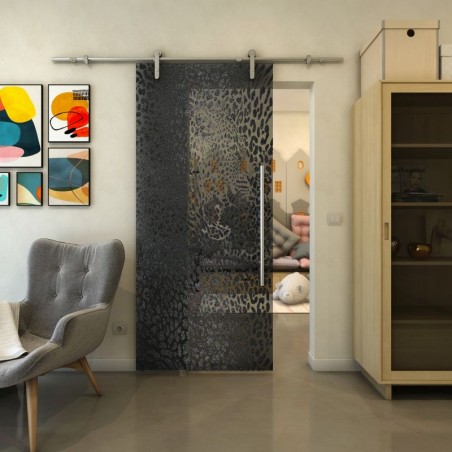 Glasschiebetüren mit Fineprint auf Grauglas – Pipe-Line-Schwarz-Farbe