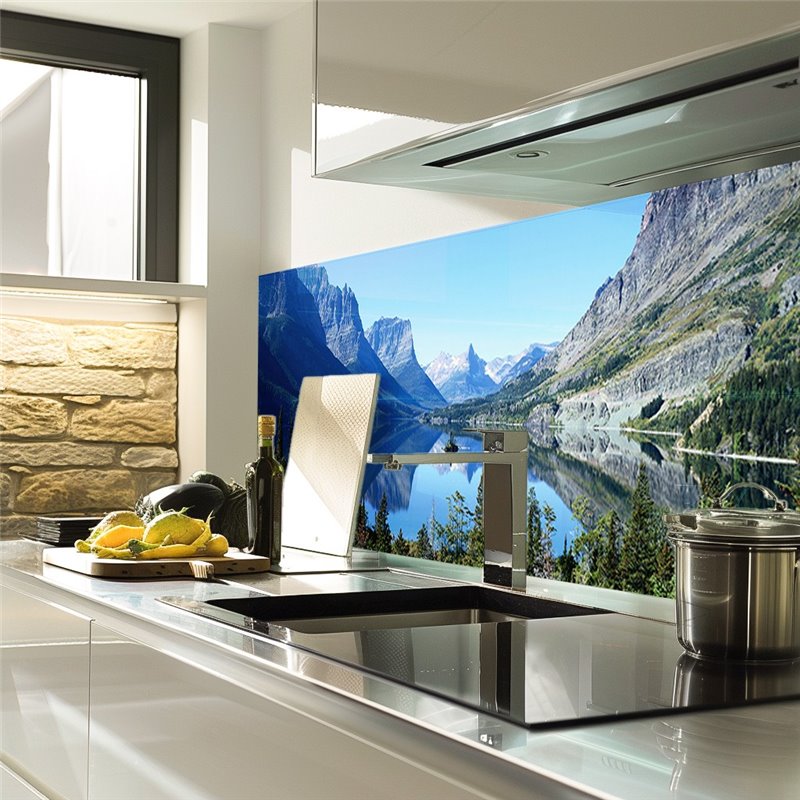 Bringen Sie Ihre Küche zum Strahlen und verwandeln Sie sie in einen einladenden und inspirierenden Raum mit unserer Küchenrückwand aus 6 mm ESG-Glas mit Digitaldruckmotiv.